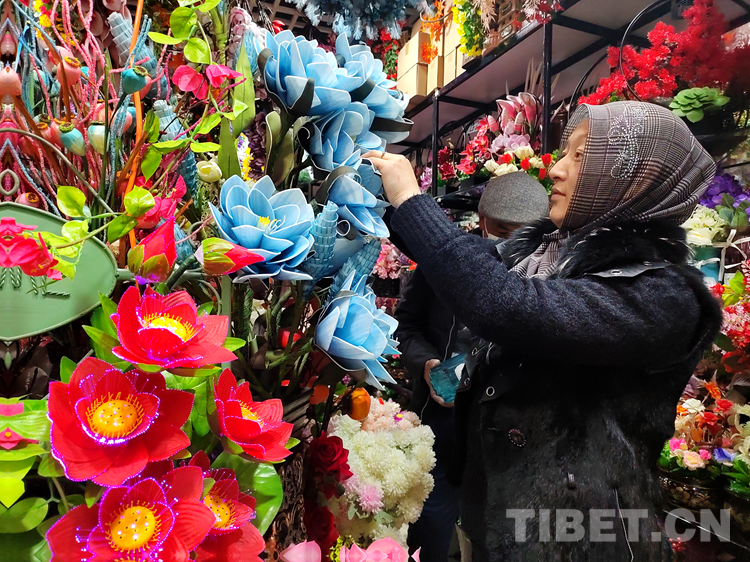 “我家店里客人挺多的,尤其這幾天,首先是因?yàn)槲覀兊幕ǚN齊全,應(yīng)有盡有,價(jià)格也實(shí)惠,其次我們之間能進(jìn)行簡(jiǎn)單的溝通,我會(huì)一些日常簡(jiǎn)單的藏語(yǔ),他們也會(huì)說(shuō)一些漢語(yǔ)。所以挺受大家歡迎?!蹦履不ǚ坷习迥擦岣吲d地說(shuō)。