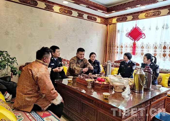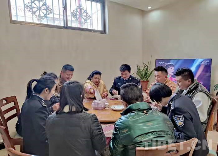 在藏歷水虎年到來之際,拉薩出入境邊防檢查站3名民警利用勤務(wù)間隙,帶著精心準(zhǔn)備的節(jié)日慰問品前往結(jié)親民警尼瑪拉姆家中拜年。熱情好客的尼瑪拉姆一家用特色風(fēng)干肉、煮牛肉、卡塞、時(shí)鮮水果等美食款待了前來結(jié)親的民警們。