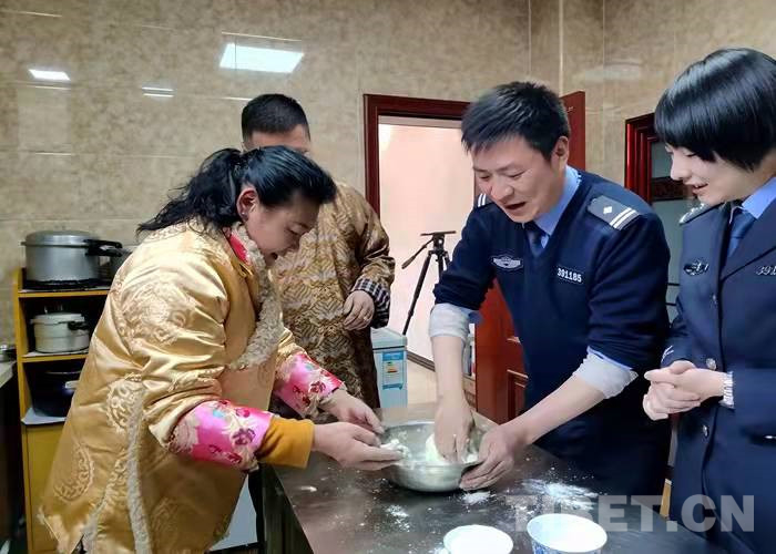 廚房里香味四溢,叔叔阿姨正在熬制古突(一種用牦牛肉湯熬煮的面食),民警們和面、搓面疙瘩,大家有說有笑分享著過藏歷新年的喜悅。“你們過年也要堅(jiān)守崗位,今天咱們就一起吃‘古突’開開心心過個(gè)年。一會(huì)咱們還要在面疙瘩里包辣椒、毛線、羊毛、硬幣等9樣?xùn)|西。吃到這些東西的人要即時(shí)吐出?!泵窬瘋兟牭桨赚敯⒁讨v的這些感到十分有趣。