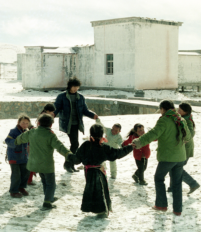 這是青藏公路線上的唐古拉山道班小學(xué)師生,在課間活動中跳起“鍋莊”舞(唐召明1990年攝)