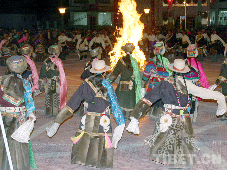 這是那曲地區(qū)雙湖特別區(qū)(現(xiàn)那曲市雙湖縣)牧民群眾在“撤區(qū)建縣”慶祝大會活動中,圍著篝火跳起歡樂的“鍋莊”舞(唐召明2013年攝)