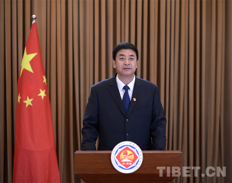 圖為西藏自治區(qū)主席嚴(yán)金海發(fā)表電視講話紀(jì)念百萬(wàn)農(nóng)奴解放63周年 西藏自治區(qū)黨委宣傳部供圖