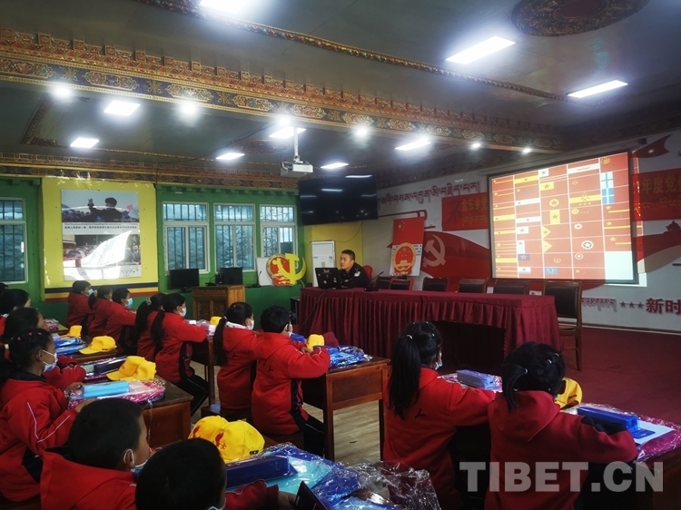 當(dāng)天,西藏林芝金東邊境派出所民警李青昀早早地起床,又認(rèn)真熟悉了一遍課件內(nèi)容,帶著電腦來到了朗縣國門講習(xí)所,他要為當(dāng)?shù)匦W(xué)生帶來愛國主義小課堂。