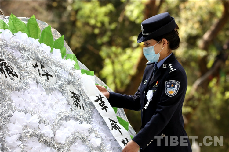 圖為民警為烈士敬獻(xiàn)花圈后整理挽聯(lián) 攝影:鄒興國