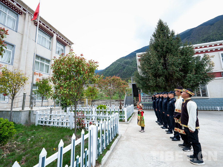 來自派鎮(zhèn)雪卡村的5歲小女孩旦增玉珍在林芝邊境管理支隊派邊境派出所,與移民管理警察共同參加升旗儀式。還在上幼兒園的她,像學校里的哥哥姐姐們一樣,一邊敬禮一邊唱國歌,同派出所民警一起接受愛國主義熏陶。