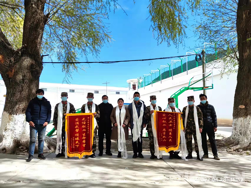 圖為洛隆縣人民醫(yī)院為光榮獻(xiàn)血的洛隆縣武警支隊(duì)官兵們送上錦旗