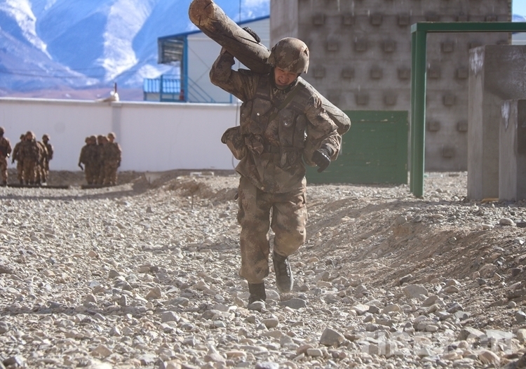 圖為阿里軍分區(qū)某部官兵進(jìn)行負(fù)重訓(xùn)練