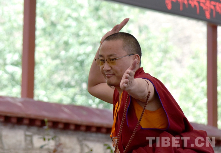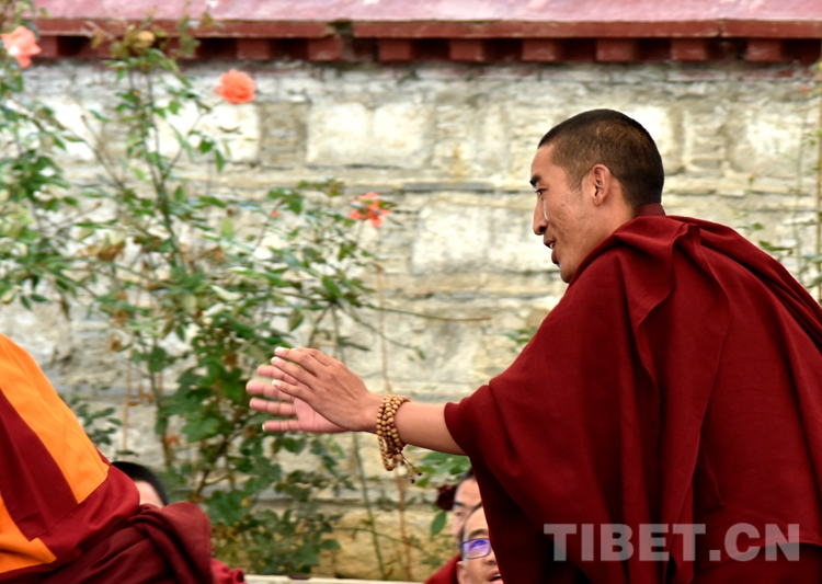 中國西藏網(wǎng)訊 身穿絳紅色袈裟,坐者仔細(xì)聆聽、站立者臂套念珠、迸出佛學(xué)妙語;圍觀者不時(shí)大笑……這是6月21日下午記者在西藏佛學(xué)院辯經(jīng)場看到的“唇槍舌戰(zhàn)”。