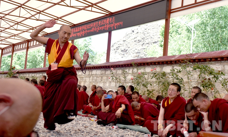 圖為6月21日下午,中國(guó)藏語(yǔ)系高級(jí)佛學(xué)院2022級(jí)“拓然巴”高級(jí)學(xué)銜班招生考試西藏考點(diǎn)現(xiàn)場(chǎng),考僧正在互辯。攝影:王媛媛
