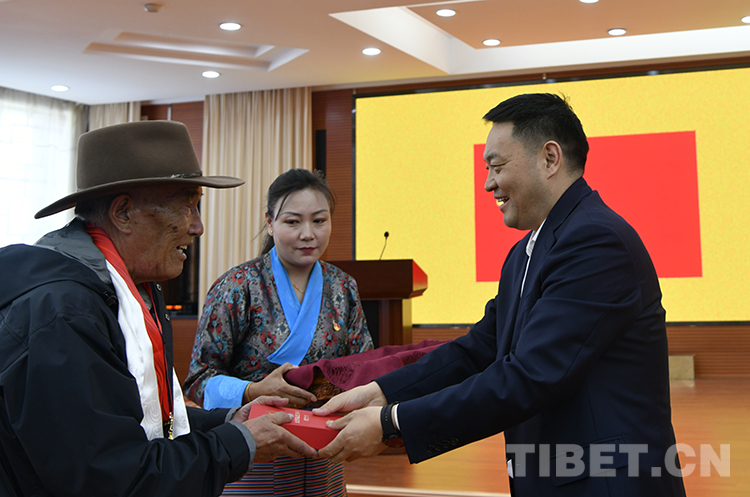 圖為西藏自治區(qū)黨委常委、統(tǒng)戰(zhàn)部部長,自治區(qū)政協(xié)黨組副書記、副主席嘎瑪澤登向“光榮在黨50年”的老黨員頓珠多吉頒發(fā)紀(jì)念章 攝影:王媛媛