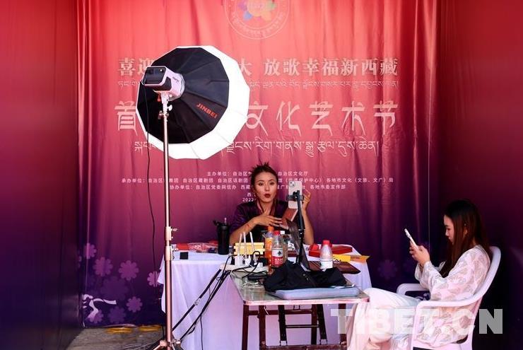圖為在首屆西藏文化藝術(shù)節(jié)主場地——拉薩市金城公主劇場附近工作人員正在進(jìn)行直播帶貨 攝影:王佳豪