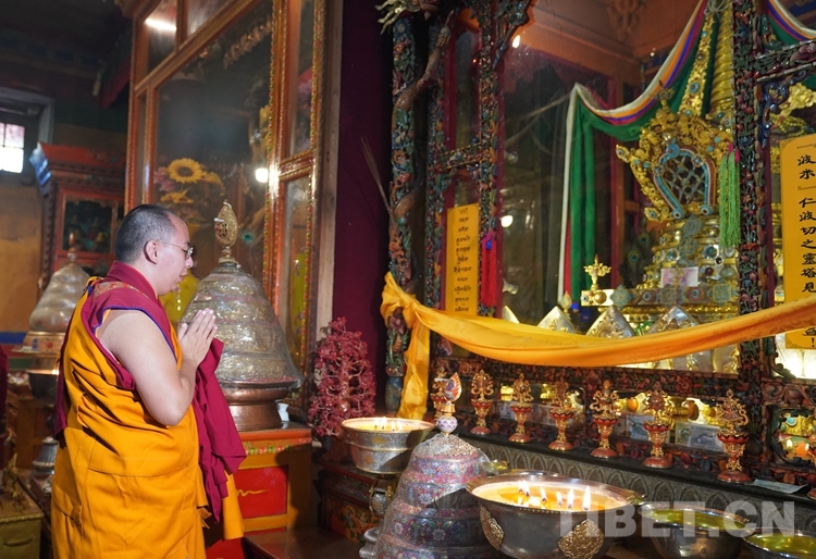 圖為班禪在羊堅多康殿波米仁波切靈塔前誦經(jīng)祈禱 攝影:王淑