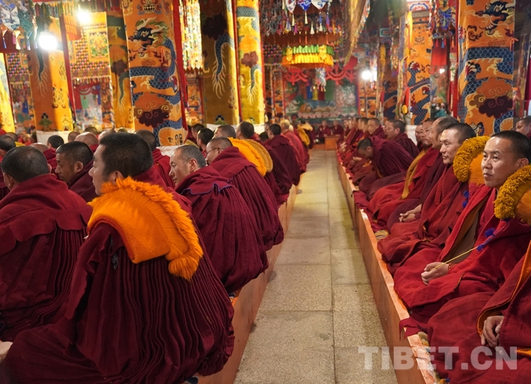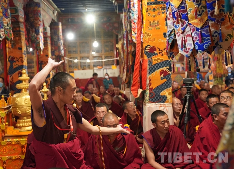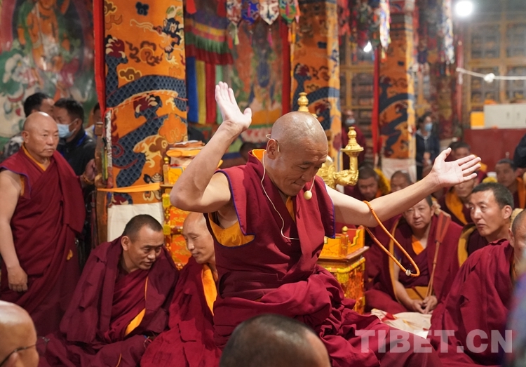 朝拜結(jié)束后,班禪步入甘丹寺夏孜扎倉,現(xiàn)場觀摩2023年度西藏自治區(qū)藏傳佛教學經(jīng)僧人晉升格西拉讓巴學位夏季預考活動。