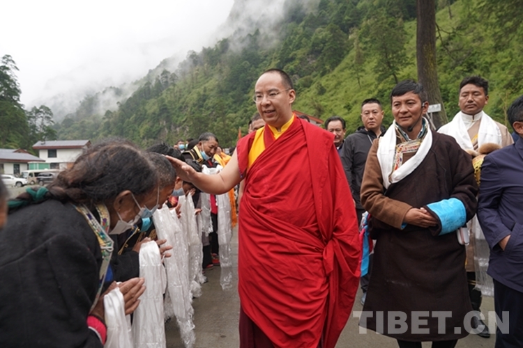調(diào)研結(jié)束,班禪徒步走出珞瓦新村,為村口列隊(duì)歡送的信教群眾一一摸頂賜福,并給村內(nèi)所有信教群眾送上了經(jīng)過(guò)加持的金剛結(jié)、法相照片和像章。