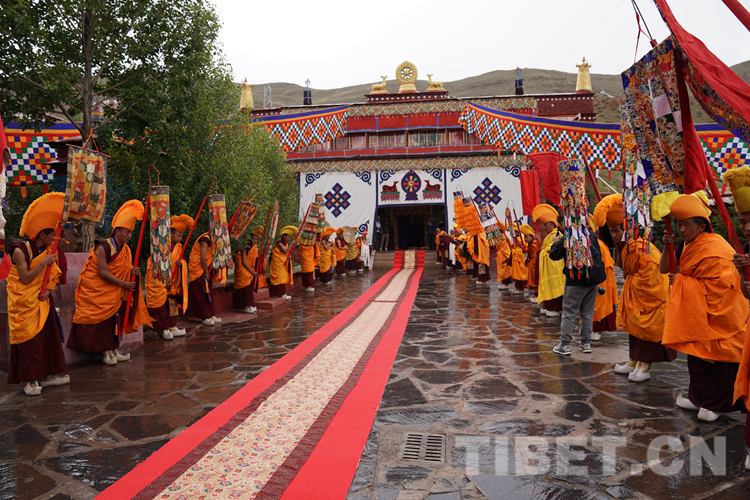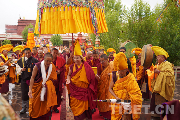 隨后,班禪在桑頂寺僧人和儀仗隊引領下緩緩入寺,依次朝拜銀塔菩提殿、密宗殿、強巴佛殿、次久拉康后至寺廟學經院禮佛講經。