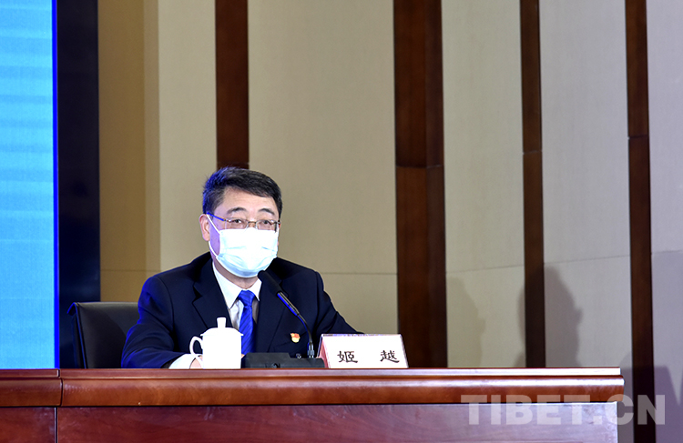 圖為西藏自治區(qū)新型冠狀病毒肺炎疫情防控工作第三場新聞發(fā)布會上,西藏自治區(qū)旅游發(fā)展廳黨組成員、副廳長姬越介紹游客服務(wù)保障方面工作 攝影:王媛媛
