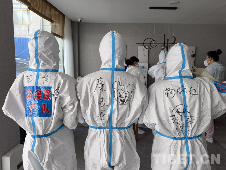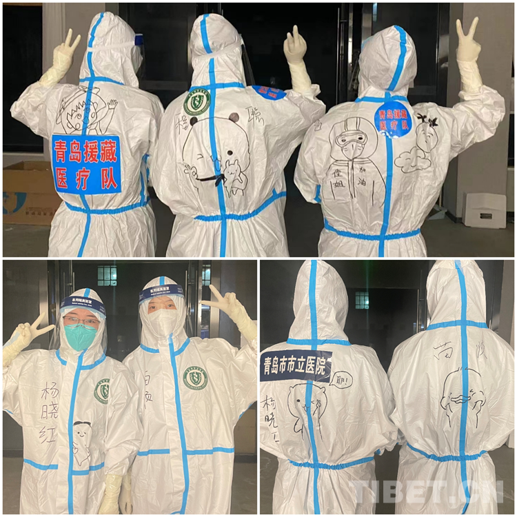 圖為青島“大白”們身著漫畫(huà)“戰(zhàn)袍”在日喀則戰(zhàn)“疫”一線合影留念