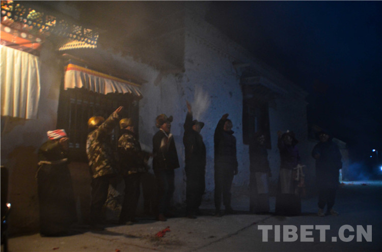 圖為查斯一家和鄰居在古突夜時一起拋灑糌粑祈福 攝影:歐帆