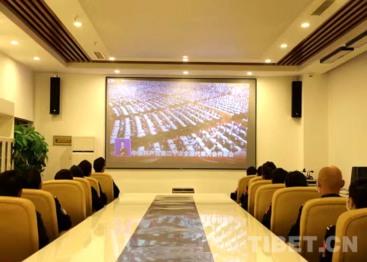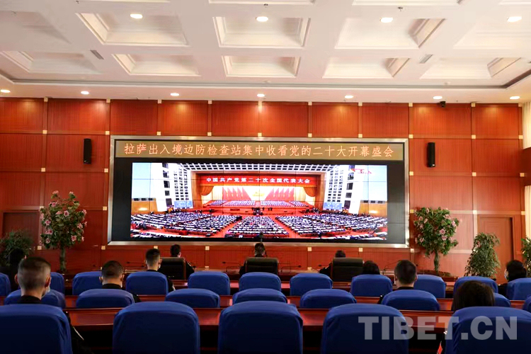 圖為拉薩出入境邊防檢查站機關民警在指揮中心會議室組織觀看黨的二十大開幕會盛況直播