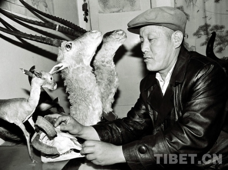 這是洛桑丹珍在他的家庭博物館里整理所收藏的動物標(biāo)本(唐召明1998年攝)