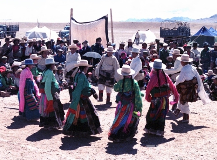 這是文部辦事處(現(xiàn)尼瑪縣)賽馬會(huì)上,牧民群眾在跳“鍋莊”舞(唐召明1987年攝)