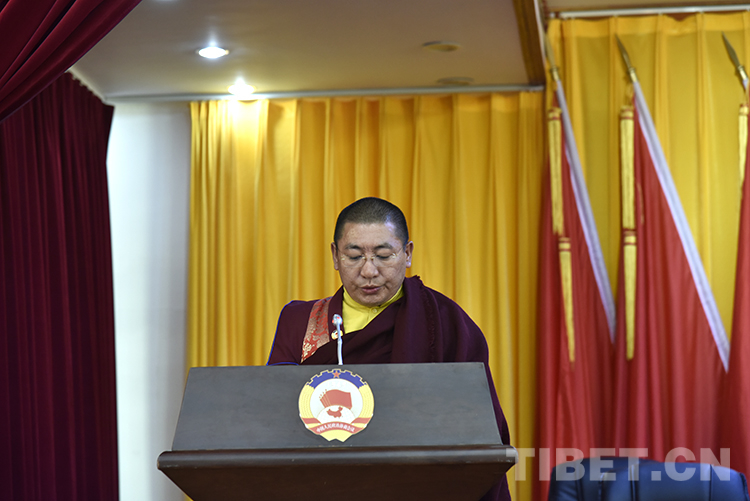 圖為12月12日,拉薩市政協(xié)十二屆三次會(huì)議第二次全體會(huì)議現(xiàn)場(chǎng),宗教界委員曲仲·阿旺強(qiáng)久旦增加措發(fā)言 攝影:王媛媛