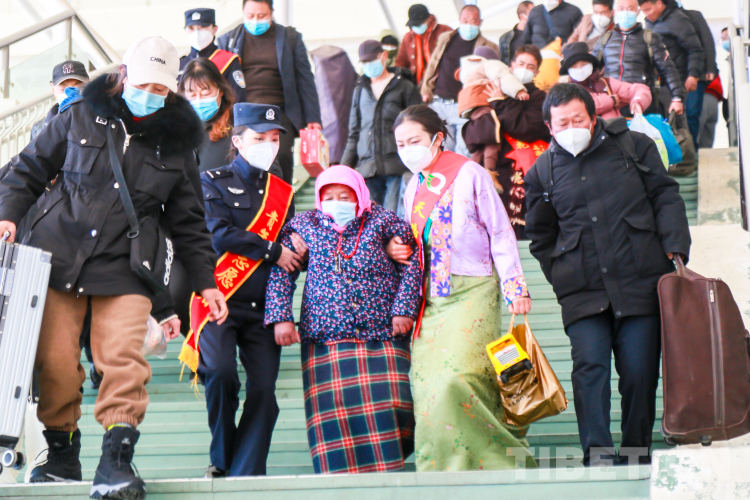 圖為拉薩鐵路公安處“格桑花”女子警組民警與拉薩火車站志愿者共同為老年出行旅客提供幫助(胡安鵬 攝)
