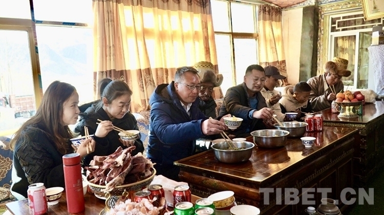 “這些干部和我們相處了這么長時間,都成自家人了。他們家在內(nèi)地,但因?yàn)楣ぷ鞅仨殘?jiān)守崗位。我們能做的也不多,就是請他們到家中來吃個簡單的團(tuán)圓飯?!?多章說著,老人的女兒央金熱情地端來酥油茶。