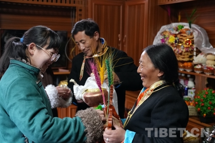 天亮以后,扎西江村一家人穿上新衣服,輪流敬切瑪、喝青稞酒,互道“扎西德勒”。扎西江村家的小女兒達娃倉決吃切瑪?shù)臅r候,先用拇指和食指抓起一小撮糌粑灑向空中3次,表示敬天地,然后把糌粑放進自己嘴里。喝青稞酒也同樣如此,要先用雙手接過酒杯,然后左手拿杯,右手無名指輕輕地在杯中蘸酒,彈向空中,如此反復三次。