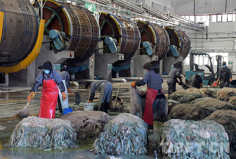 這是西藏地球第三極皮革產業(yè)有限公司浸水車間工人正在為羊皮進行脫毛工作(唐召明2023年4月5日攝)
