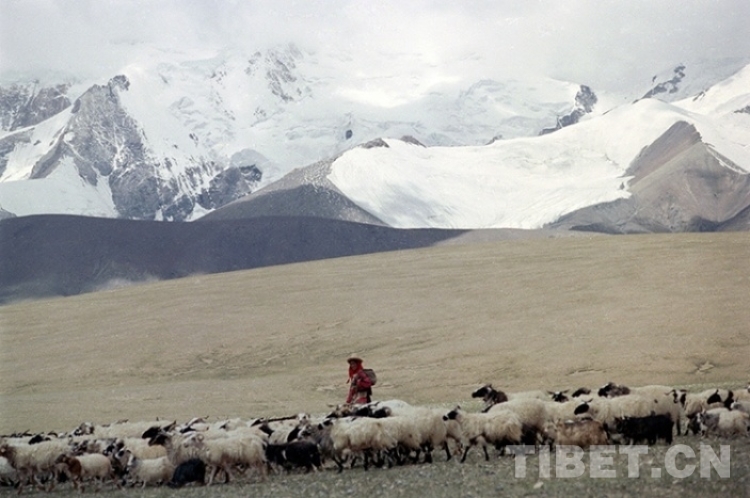 這是一位牧女在藏北雪山下放牧羊群(唐召明1996年攝)