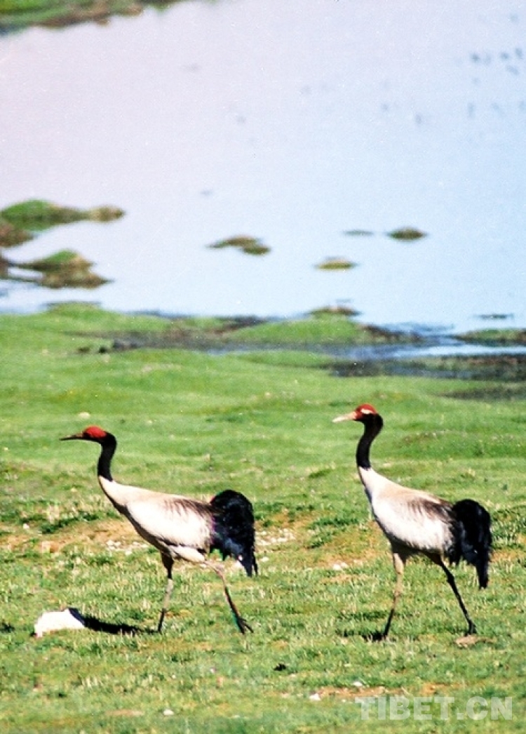 這是兩只漫步在藏北色林錯(cuò)國家級(jí)自然保護(hù)區(qū)的國家一級(jí)保護(hù)動(dòng)物、被稱為“鳥類熊貓”的黑頸鶴(唐召明2001年攝)