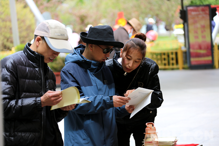 圖為在現(xiàn)場(chǎng)參加活動(dòng)的群眾、游客翻閱宣傳手冊(cè)并聽(tīng)取宣傳人員的講解 攝影:王佳豪
