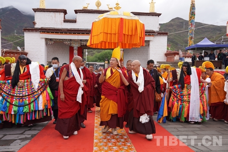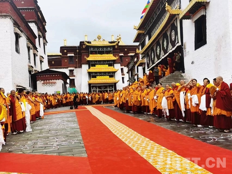 當天清晨,強巴林寺桑煙氤氳,僧人儀仗隊早早在寺廟正門通往措欽大殿的通道兩側(cè)手捧哈達列隊等候,以藏傳佛教最高宗教儀軌迎接班禪。