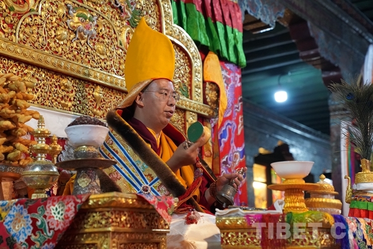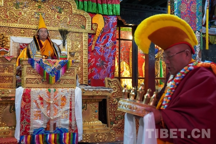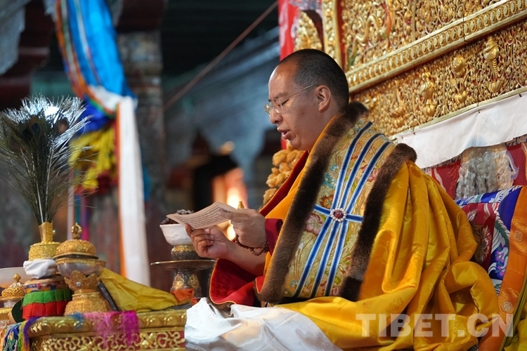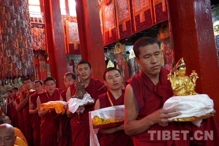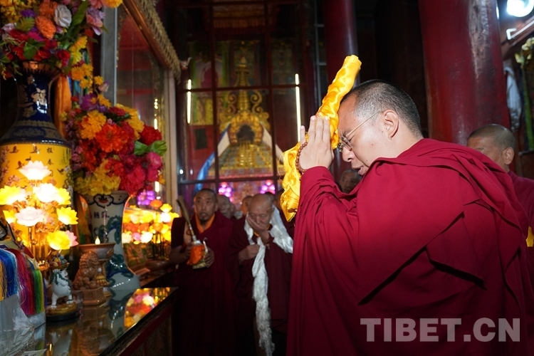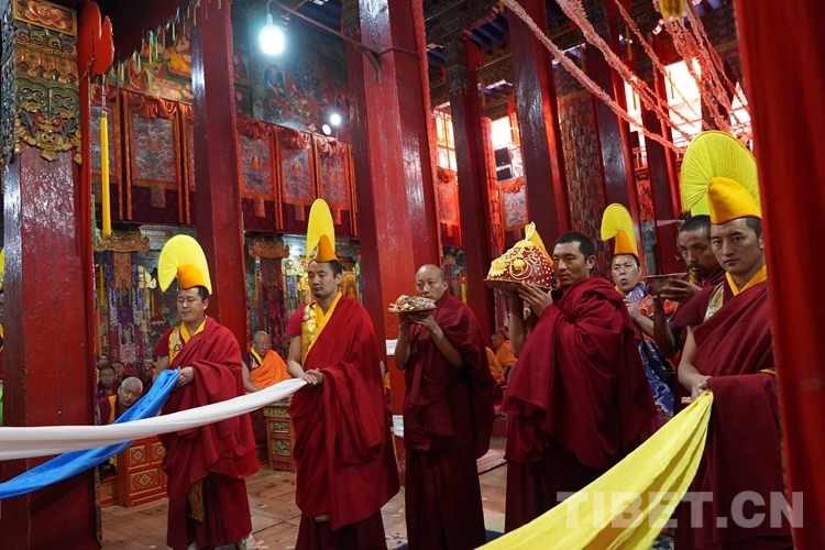 在措欽大殿內(nèi),班禪每到一座佛像前都雙手合十為眾生祈禱,并向佛像敬獻哈達,祈求國泰民安、利樂眾生。措欽大殿內(nèi)的眾僧也并排而坐齊聲誦經(jīng)、虔誠祝禱。禮佛后,班禪登上措欽大殿寶座,寺廟高僧代表向班禪敬獻曼扎(佛像、經(jīng)書、佛塔)、誦祈愿永駐贊;班禪向寺廟僧眾傳授賜予《文殊真實名經(jīng)》,并為僧眾摸頂。