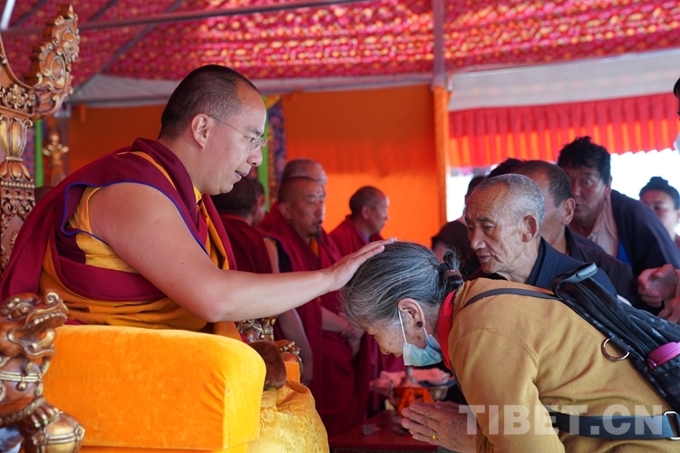 年逾七旬的洛桑巴姆得到班禪摸頂后倍感殊勝,激動地落下了眼淚?!澳馨菀娀罘鹛貏e開心,得到活佛的摸頂賜福是我的福分?!甭迳0湍凡粩嗷仡^面向班禪躬身祈禱,久久不愿離去。