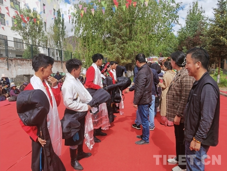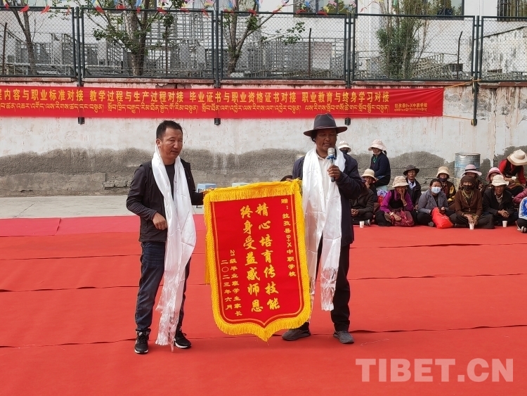 活動現(xiàn)場,學(xué)生家長代表向?qū)W校贈送錦旗并發(fā)表感言?!案兄x拉孜縣9+X中職學(xué)校培養(yǎng)了我的孩子,經(jīng)過學(xué)校的精心培養(yǎng),讓家人操碎心的孩子如今依靠從學(xué)校學(xué)到的技藝找到了一份滿意的工作,這讓我一家人感到很欣慰。”學(xué)生家長代表白瑪有感而發(fā),“希望在場的孩子們也通過發(fā)揮自己的優(yōu)勢,在社會上找到一份心儀的工作,同時真心祝福學(xué)校越辦越好?!?/p>