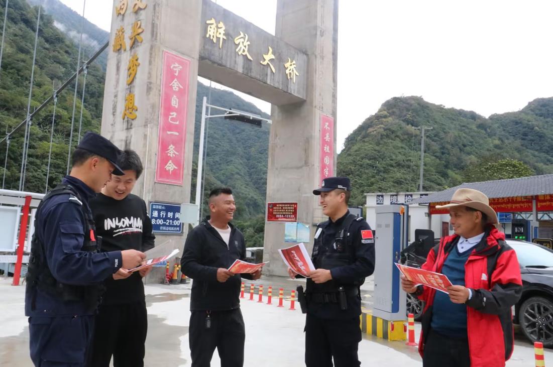 圖為背崩邊境派出所解放大橋執(zhí)勤點民警為過往群眾講解邊境條例相關(guān)知識 攝影:呂恒剛