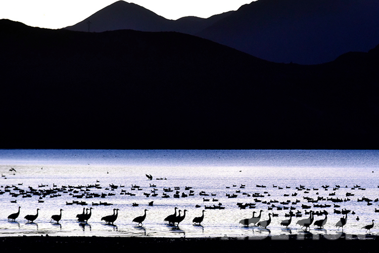 圖為晨光熹微,黑頸鶴在拉薩林周虎頭山水庫棲息 攝影:王媛媛