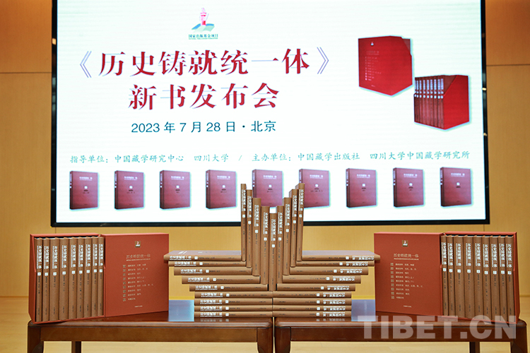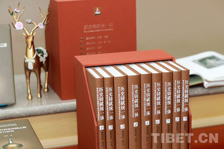 圖為發(fā)布會(huì)現(xiàn)場(chǎng)展覽的《歷史鑄就統(tǒng)一體:考古與文物所見西藏和中原關(guān)系資料研究》全套圖書 攝影:陳衛(wèi)國(guó)
