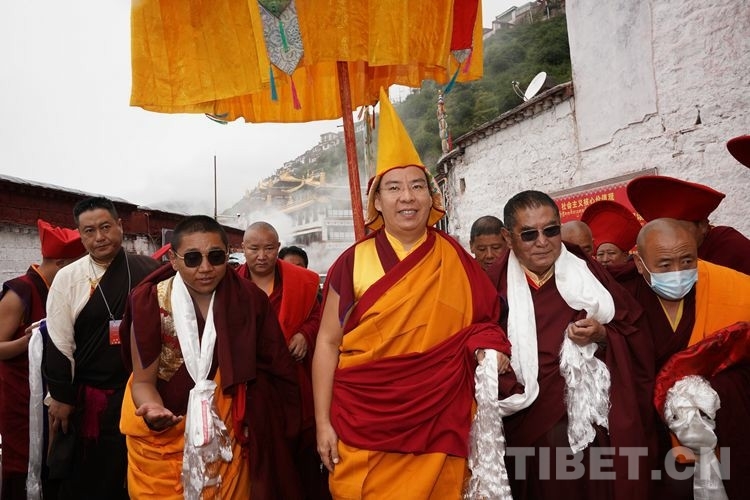 當日11時許,在眾僧的期盼中,班禪一行抵達直孔替寺。頓時,現(xiàn)場法號齊鳴、法螺合奏,直孔瓊倉·洛桑強巴活佛和僧眾在寺廟前舉行了隆重的歡迎儀式。