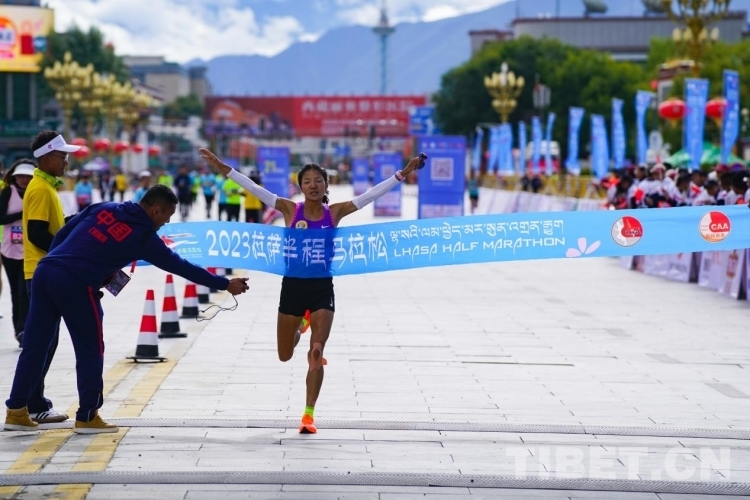 半馬女子組冠軍次仁措姆抵達(dá)終點(diǎn) 攝影:趙振宇