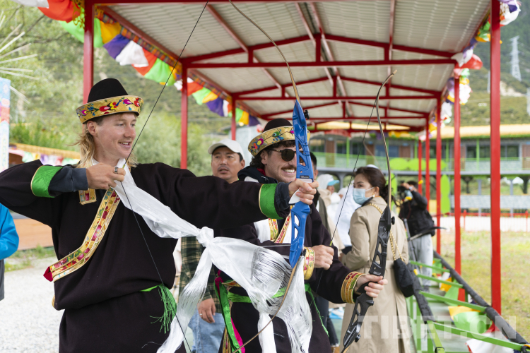 身著工布藏裝的澳大利亞籍五指山1867洲際自行車隊隊員Oliver Anderson正在和身邊的隊友進行響箭比賽。在身邊藏族村民的幫助下,Oliver Anderson的箭術越來越準,每射出一支響箭,兩位外籍運動員都因這種體育項目的獨特魅力而歡呼、擊掌。提起林芝這座城市,Oliver Anderson說:“林芝是一座非常美麗的城市,這里的天氣非常舒適,也使自己比賽狀態(tài)非常好。西藏是一處越來越開放的地方,這次能來西藏參加比賽非常榮幸。”