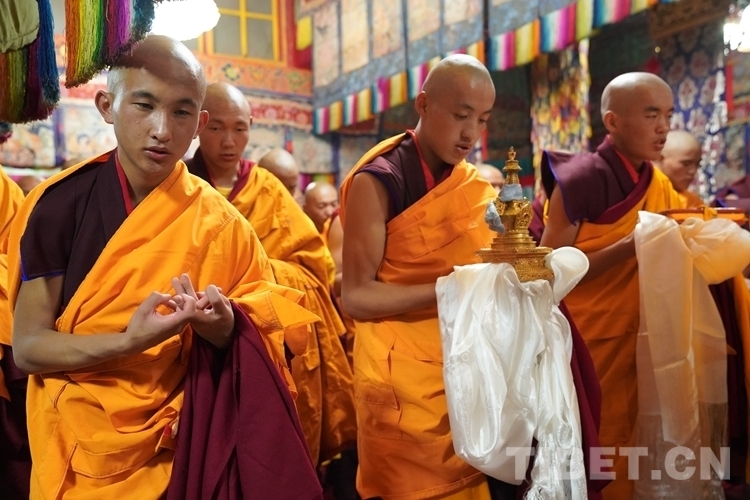 當天清晨,扎什倫布寺桑煙繚繞、法號聲聲,28 位受戒的年輕僧人帶著新制袈裟,迎著朝霞依次走向拉讓殿等待班禪授戒這一神圣時刻的到來。8時許,在手持黃傘、香爐和吹嗩吶的高僧護送引領(lǐng)下班禪緩緩步入拉讓殿,并與在場僧眾集體誦經(jīng)。誦經(jīng)儀式結(jié)束后,班禪就坐于拉讓殿寶座,4名高僧大德作為授戒眾,開始為僧人閉門授戒、剃度、賜法名、摸頂。此時,受戒僧人一一入座,兩手在胸前交叉,聽班禪引證經(jīng)典告誡,并宣誓嚴守戒律。