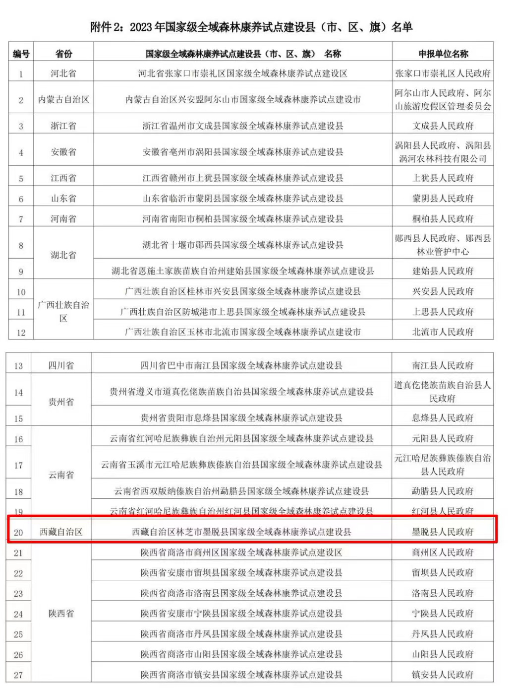 圖為2023年國家級全域森林康養(yǎng)試點建設縣(市、區(qū)、旗)名單(部分) 圖源:中國林業(yè)產(chǎn)業(yè)聯(lián)合會森林康養(yǎng)分會