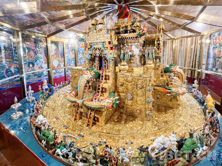 壇城,被稱作“曼荼羅”,是藏傳佛教密宗的重要元素,承載了豐富的象征意義和深刻的修行內(nèi)涵,在藏傳佛教繪畫、寺院建筑、佛塔建筑、宗教法器、佛事活動中被廣泛采用,并形成了固定的模式和種類。 據(jù)扎什倫布寺僧人扎平介紹, “壇城從整體上來講有二維壇城、三維壇城之分,但按其造型形式,表現(xiàn)內(nèi)容和使用材料可分為平面繪畫壇城、立體建筑壇城、彩砂彩粉浮雕壇城等多種類型。我們現(xiàn)在所看到的時輪壇城既是代表人體也是代表宇宙,它的每一個組成部分都與人體有著對應關系。它是用金、銀、銅、木頭等制成的立體法器壇城模型,就像立體的宮殿,這類壇城是作為密宗冥想法器,供陳列和膜拜使用。除此之外,還有金剛密法、喜經(jīng)剛兩座造型各異的壇城。殿堂頂部的壇城壁畫都是僧人以近乎于90度的立體筆觸繪制出來的,其難度可見一斑?!?nbsp;