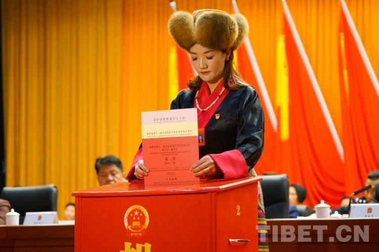 圖為拉薩市第十二屆人大代表認(rèn)真閱讀大會選票 攝影:旦曲