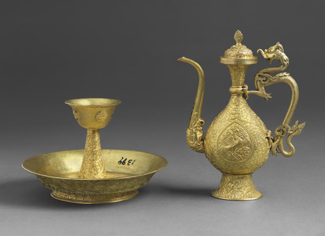 圖為公元18-19世紀(jì)龍柄執(zhí)壺及盤、杯