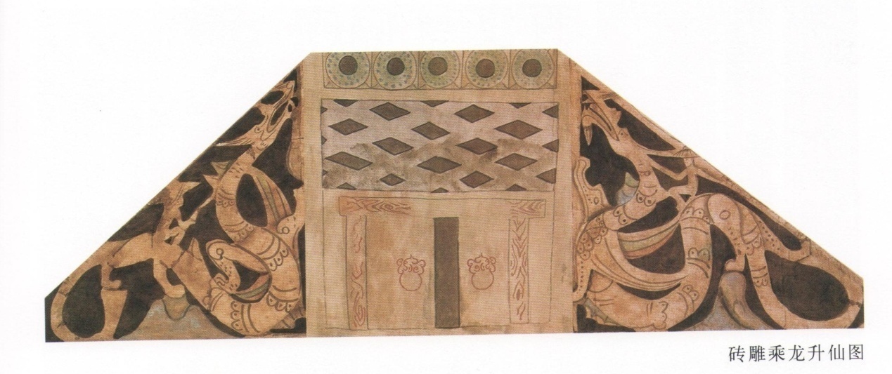 圖為洛陽(yáng)燒溝61號(hào)西漢墓磚雕造型:神人乘龍升仙圖。門(mén)上的五個(gè)玉璧代表天國(guó)之門(mén)。