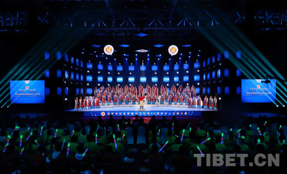 圖為西藏自治區(qū)拉薩市紀念西藏民主改革65周年千人合唱大賽在拉薩師范高等??茖W校體育館舉行